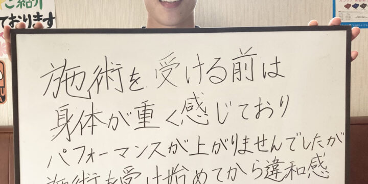 施術を受ける前は身体が重く感じておりパフォーマンスが上がりませんでしたが、施術を受け始めてから違和感も無くなり調子が良くなってきました。