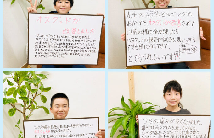 オスグットが改善しました!ランニングやジャンプをするとひざが痛くて、練習できませんでしたが、数回の施術で痛みがなくなり今では全力でランニングやジャンプができるようになりました。ありがとうございました。